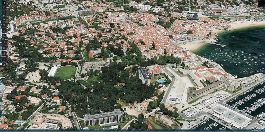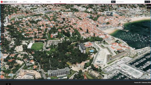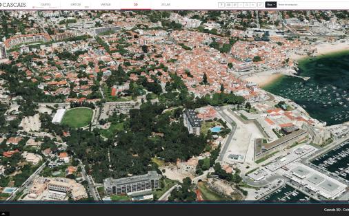 Visualização 3D, o utilizador pode visualizar o concelho de Cascais tridimensionalmente, podendo sobre este assentar outras camadas de informação tridimensional, fazer cálculos de perfil, medições, utilizar a ferramenta de linha de visão e de luz do dia.